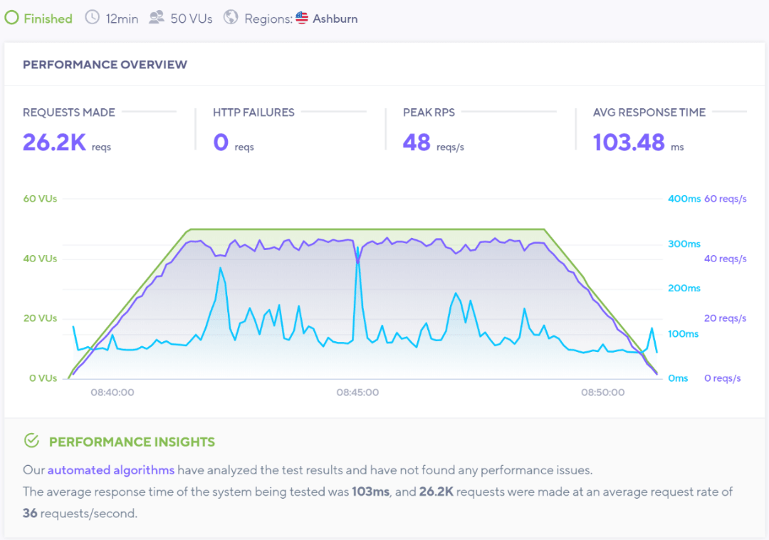 The blue line represents response time and the green line represents the increasing number of visitors. The result shows that our test site has no performance issue and handle 25 unique visits at the same time.