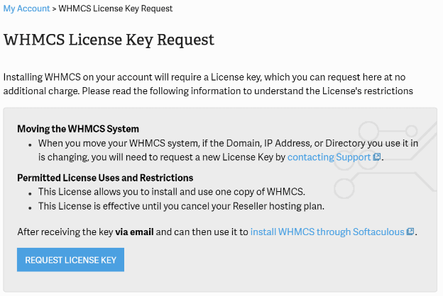 They have the option to Request WHMCS License key directly from their AMP but its a manual approval process. So you will need to wait a while to get it approved. The approved key will be mailed to you.