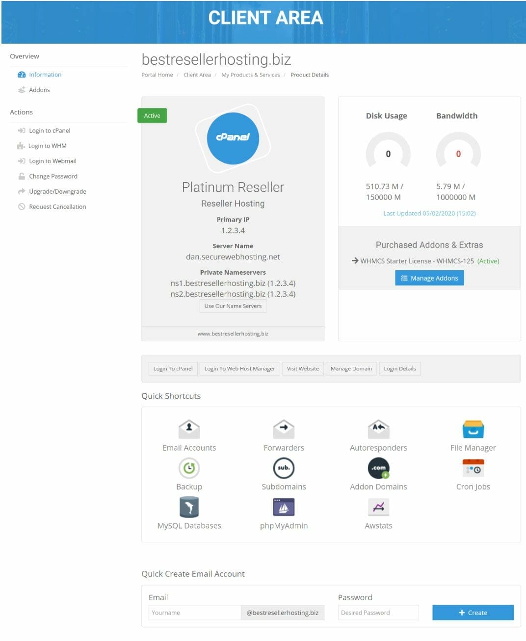 I won’t say that NameHero has the visually best website or client area when compared to others. If you look at their reseller hosting plan page, it just floods with content and not visually appealing. For the client area, they are using WHMCS. You can view your addon, and nameserver details on a single page without needing to navigate which is good.